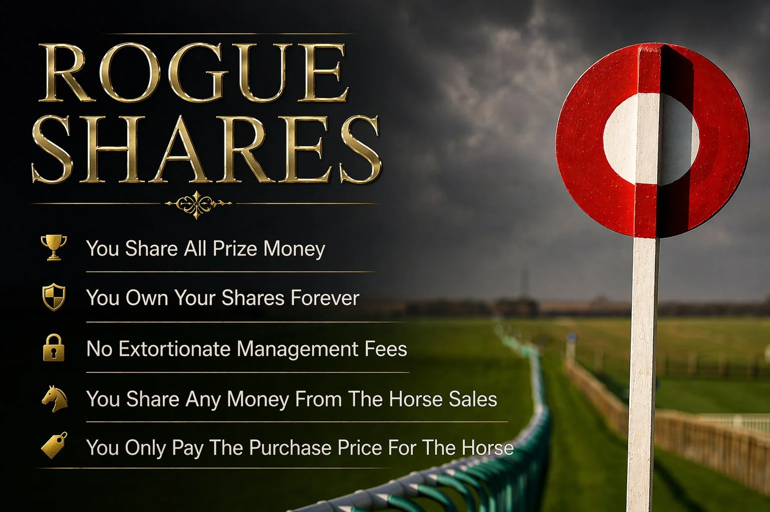 You own your shares forever - You share all prize money - Your share any money from the sale of the horse - No extortionate management fees - You only pay the exact purchase price for the horse.