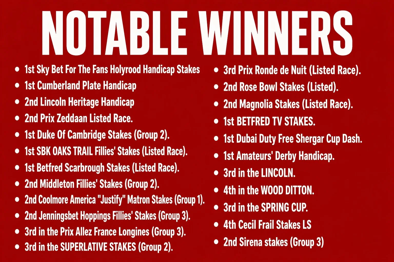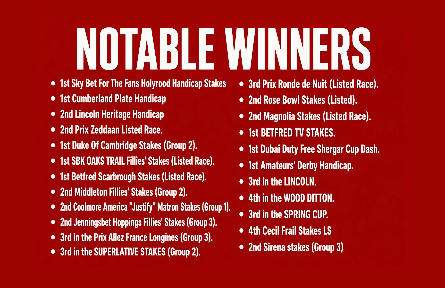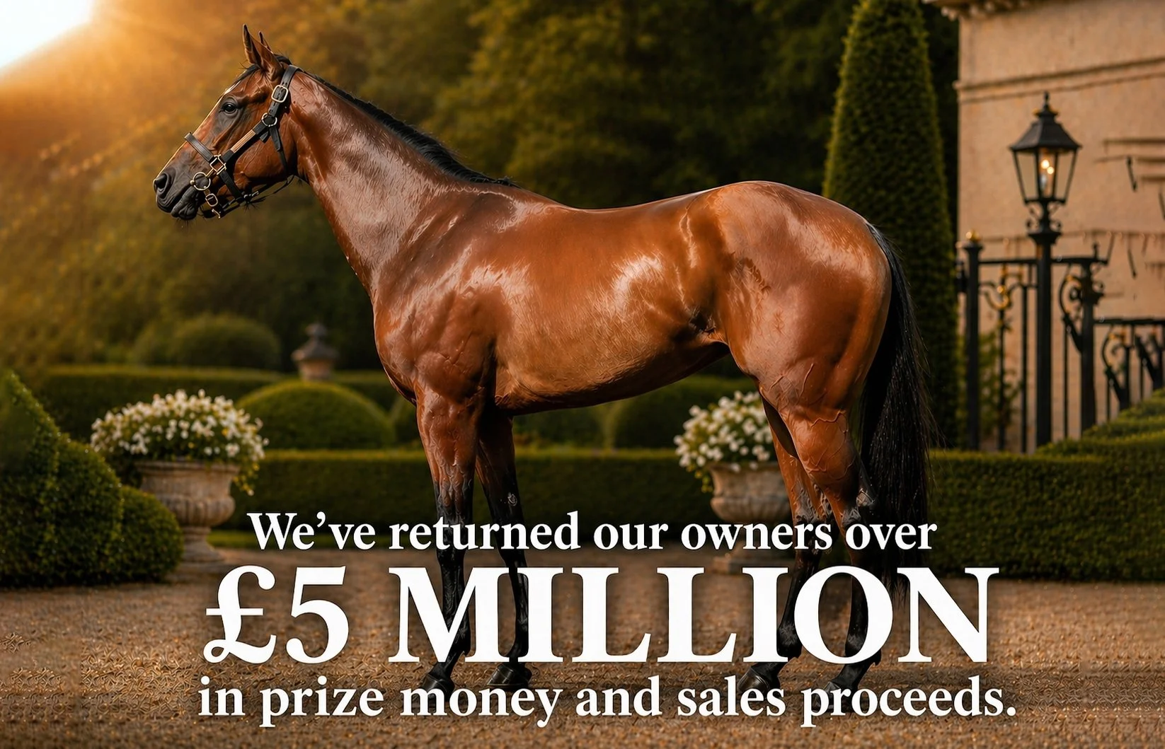 in prizemoney and sales proceeds from victories in 6 countries, including group winners, listed winners and Royal Ascot winners, and regularly selling well bought horses for seven figure sums.