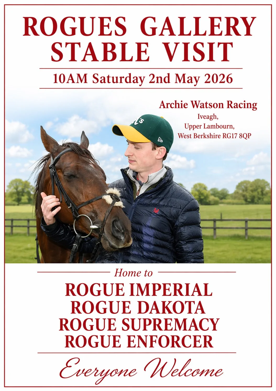 DON’T MISS THE ARCHIE WATSON STABLE VISIT COMING SOON. AN OPPORTUNITY TO MEET THE TOP TRAINER AND SEE OUR NEW SIGNINGS ROGUE IMPERIAL AND ROGUE DAKOTA, AS WELL AS ESTABLISHED STARS ROGUE SUPREMACY AND ROGUE ENFORCER
