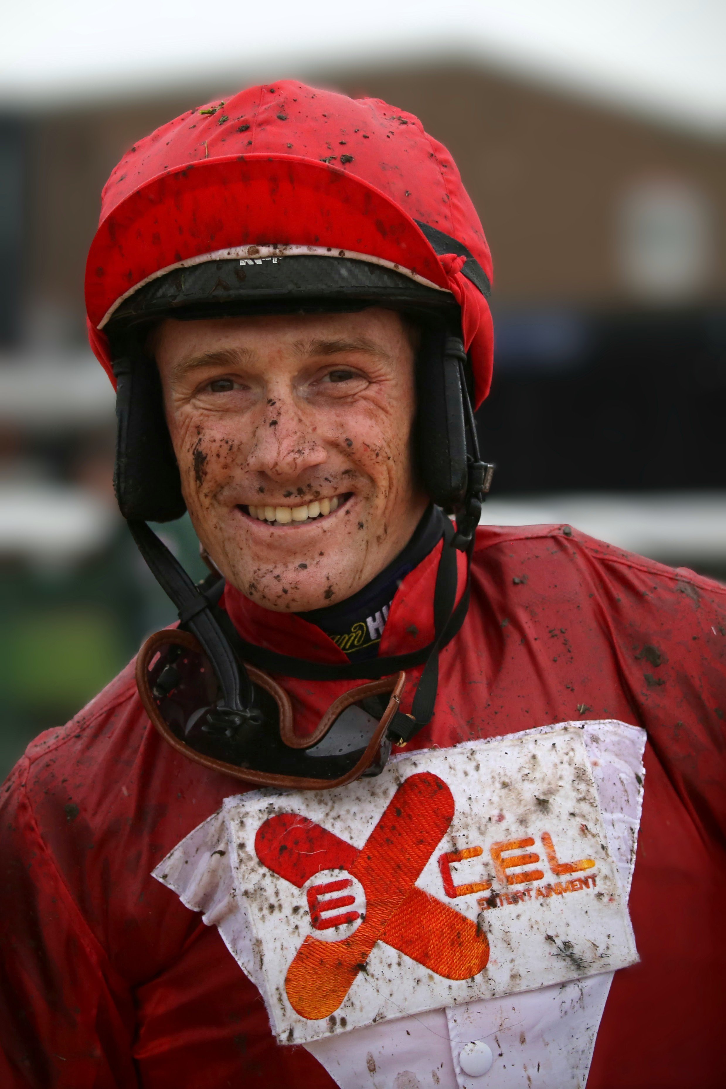 A muddy jockey wearing a red helmet and suit with a logo on the chest, smiling after a race.